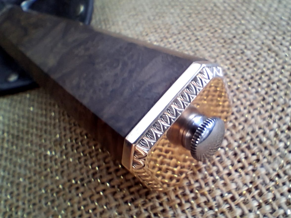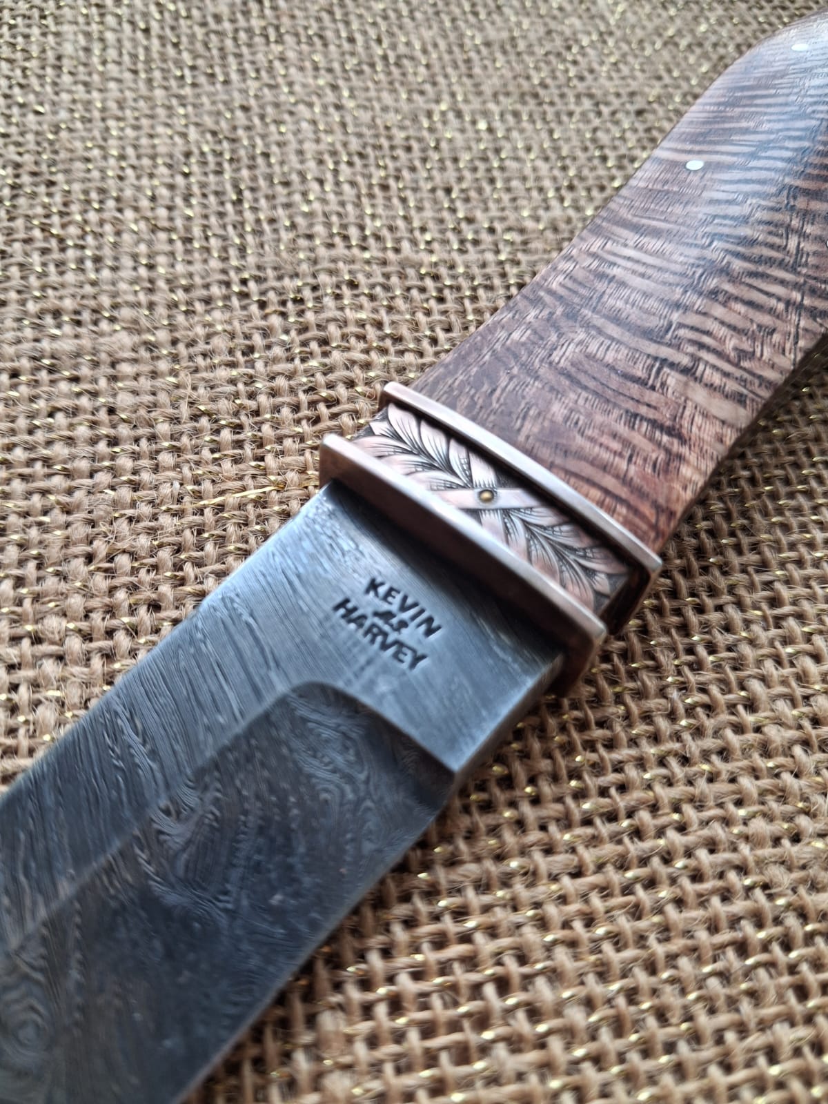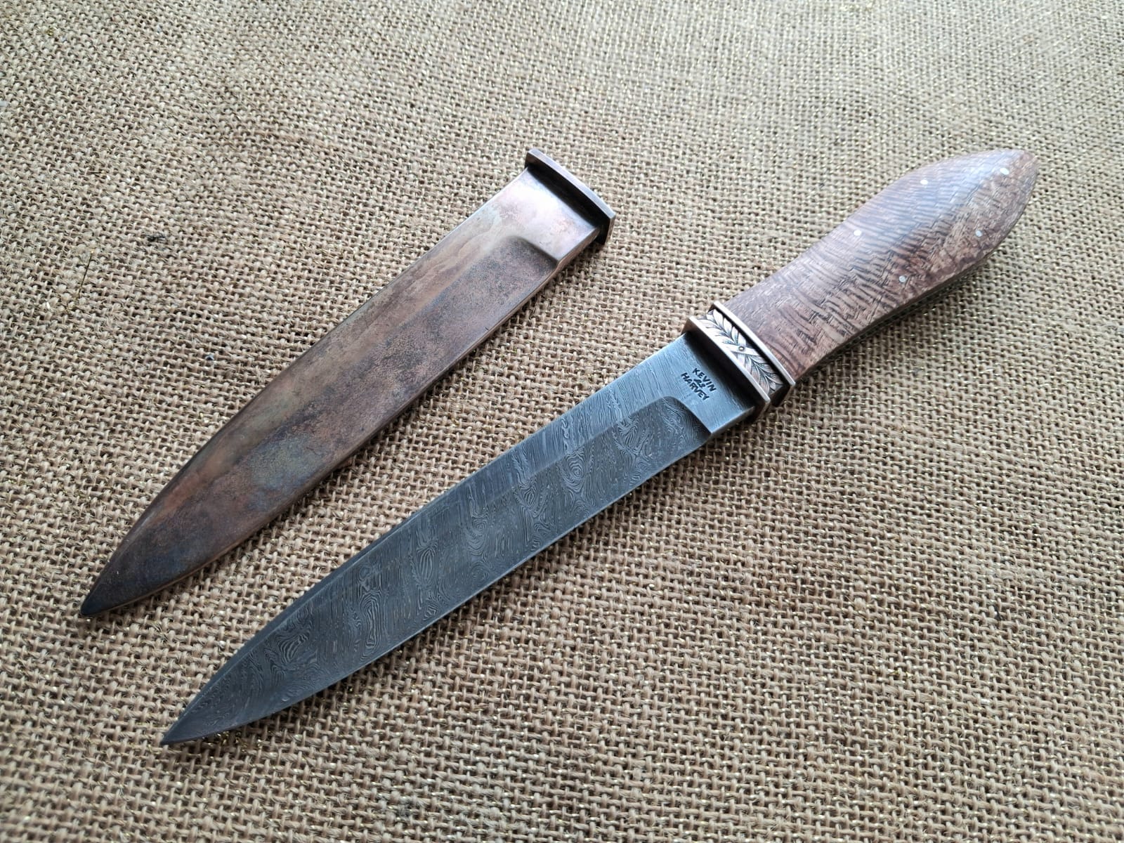 145 mm long blade of Kevin’s “Fine Twisted W’s) pattern damascus steel. Frame tang construction with a G10 fibreglass frame, nickel silver liners and Macadamia Nut, Macadamia spp. (M. integrifolia) wood. Nickel silver guard segments engraved by Kevin. Closely fitting, antiqued nickel silver scabbard. This knife was inspired by 1860s California Bowies from the Gold Rush era.