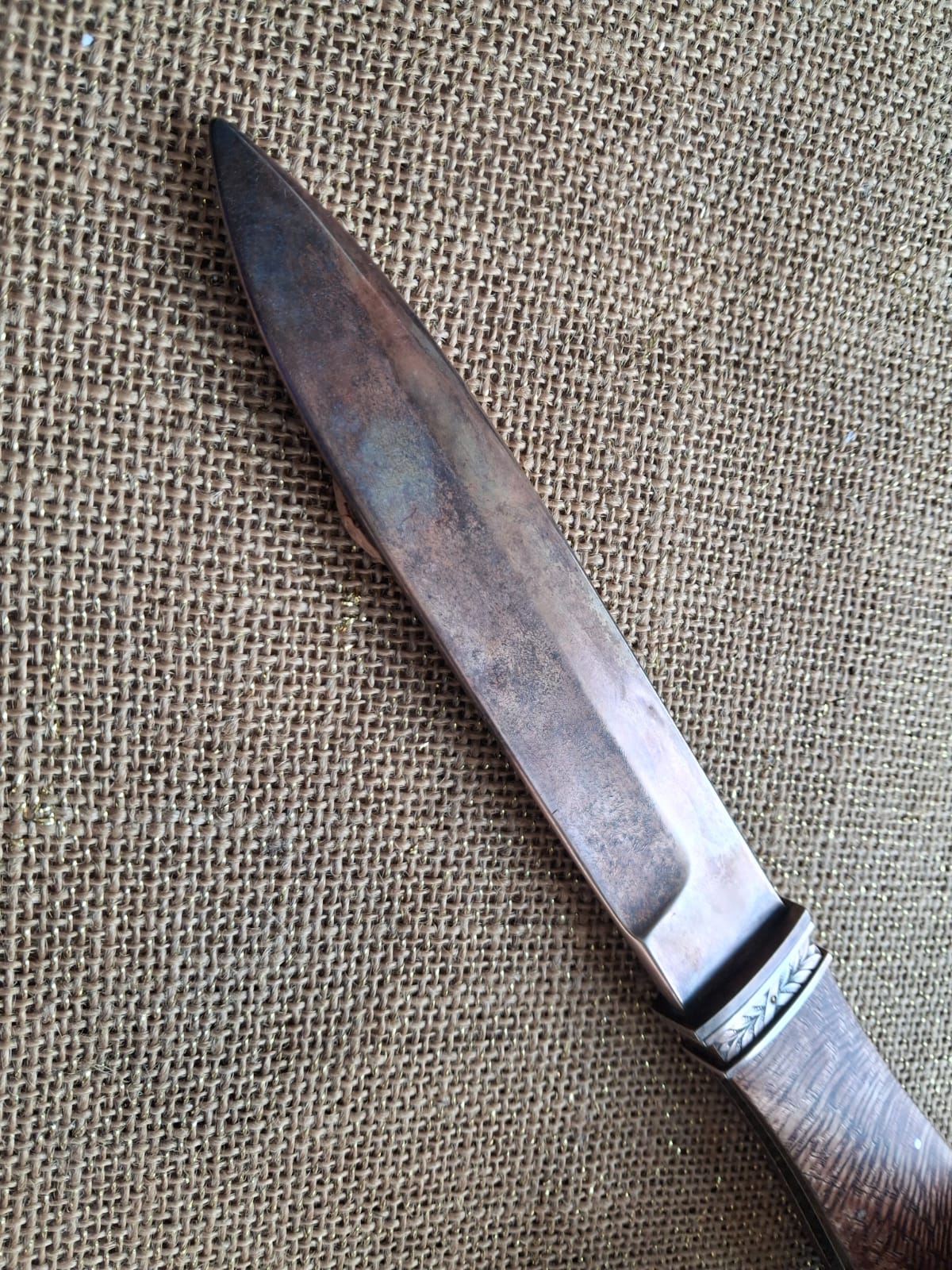 200mm long blade of hand-forged 52100 high carbon bearing steel. The blade has decorative file work on the spine and an unsharpened swedge on the drop point. Handle of Hairy Vitex (Vitex obovata) wood, through tang construction with stainless tang screw. Bronze fittings engraved by Kevin. Traditional style tube sheath of cowhide with “bronzed” decorative rivets. The knife was traditionally carried in the small of the back with the tongue fitting over the belt while the sheath holds the knife securely under the belt. This type of knife was the typical Argentinian gaucho (cowboy) everyday carry for cutting meat and self-defence.