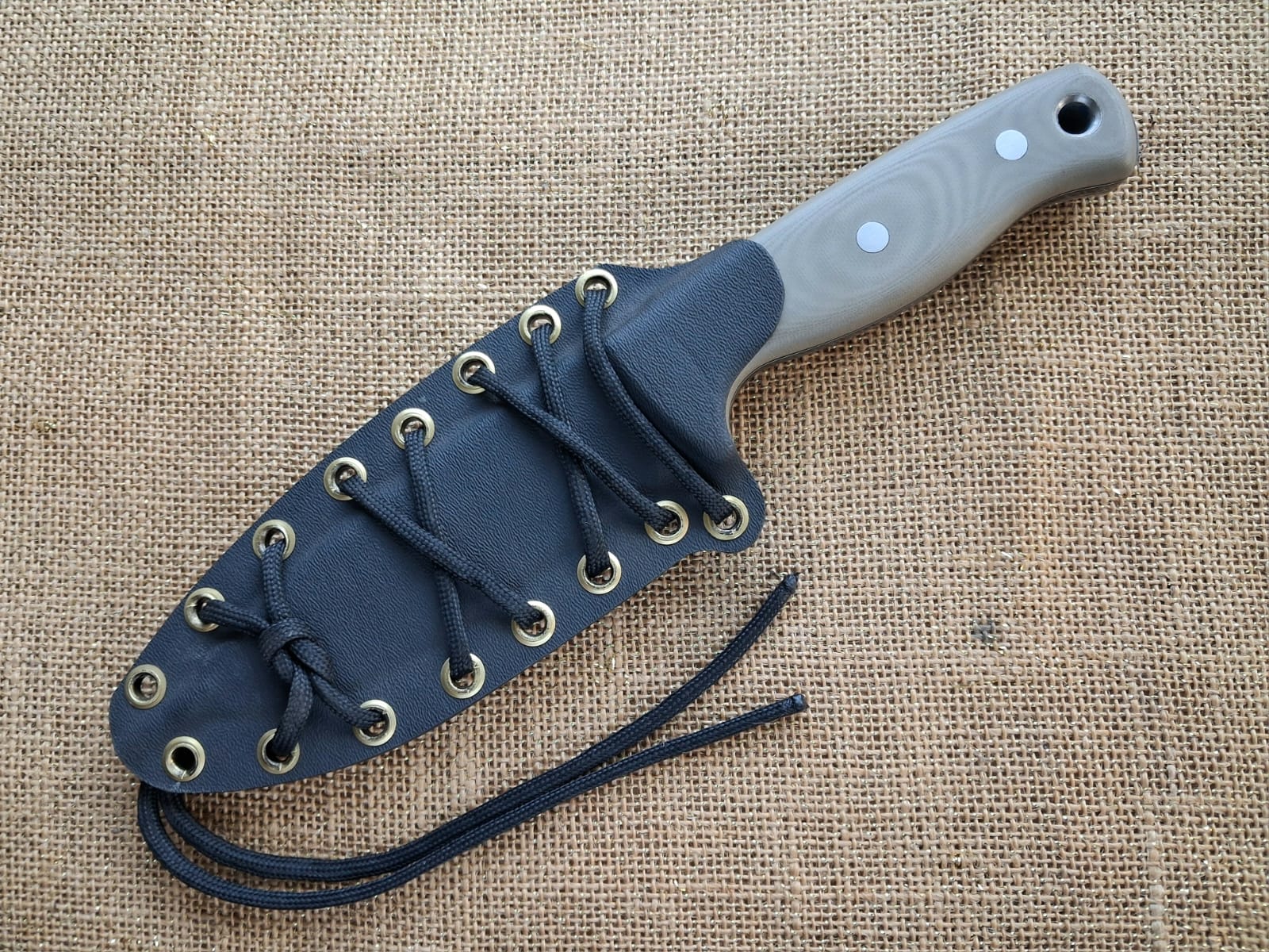 Forged, 125mm long blade of 52100 high-carbon bearing steel. Heat-treated to 61/2 Rc for hardness and toughness. True full tang construction without weight-reducing holes in the tang, for added strength. 5mm thick at the spine with a sabre grind. Handle of Desert Tan coloured glass fibre G10 handle scales fitted with 3 Corby bolts and a large lanyard hole in the exposed butt area of the tang, for battoning or hammering. Large jimping for secure thumb grip. Square edge on spine for easy fire lighting with a ferro-rod. Kydex sheath for safe pouch or backpack carry with paracord. Positive, secure “click” when inserted into its sheath. This knife embodies the values of combining both forged and stock-removed traditions. A very strong, robust knife, ideal for your “Bug-out Bag!”